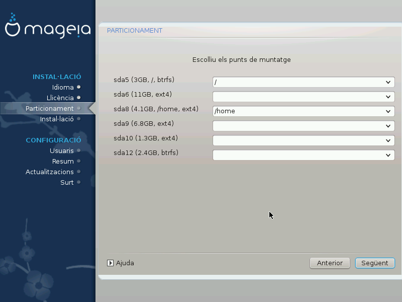 A l'esquerra dels menús desplegables hi ha una llista de particions disponibles. Per exemple: