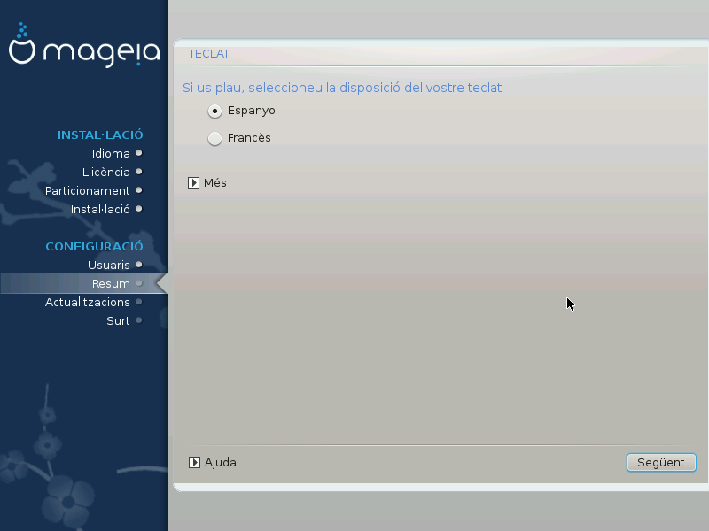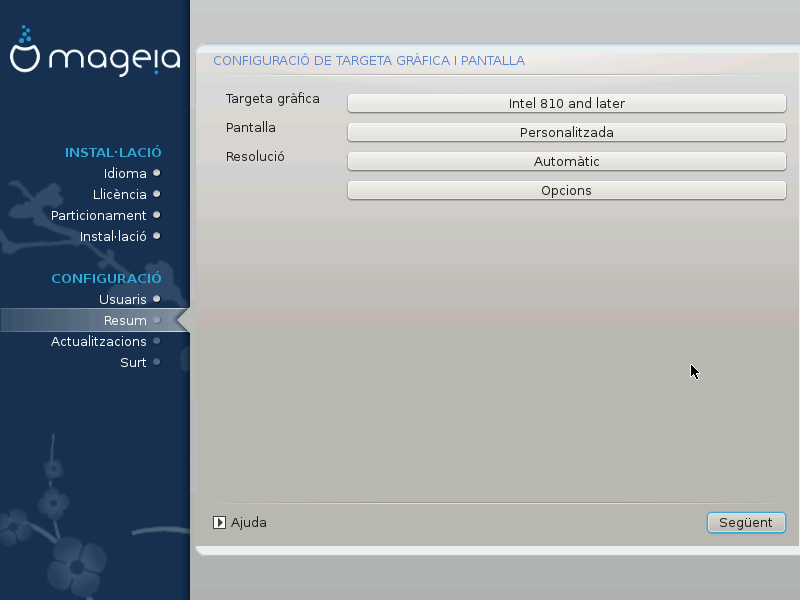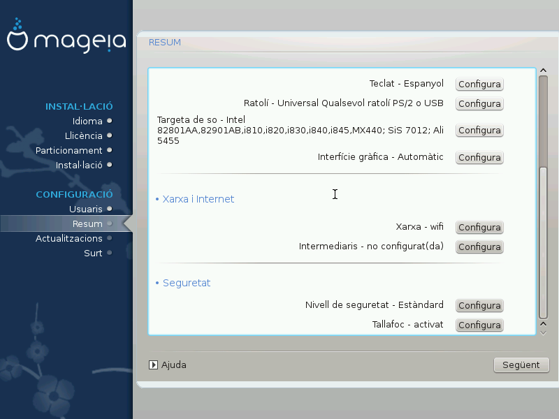 DrakX presenta una proposta per a la configuració del vostre sistema en funció de les opcions que heu fet i del maquinari detectat. Podeu comprovar la configuració aquí i canviar-la si voleu prement Configurar.