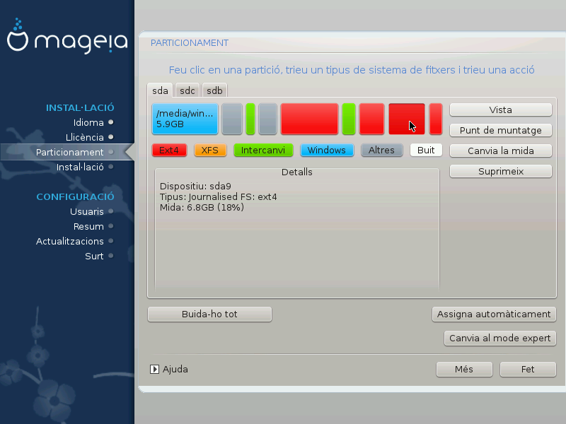 En aquesta pantalla podeu veure el contingut del(s) vostre(s) disc(s) dur(s) juntament amb les propostes de partició DrakX per on instal·lar Mageia.