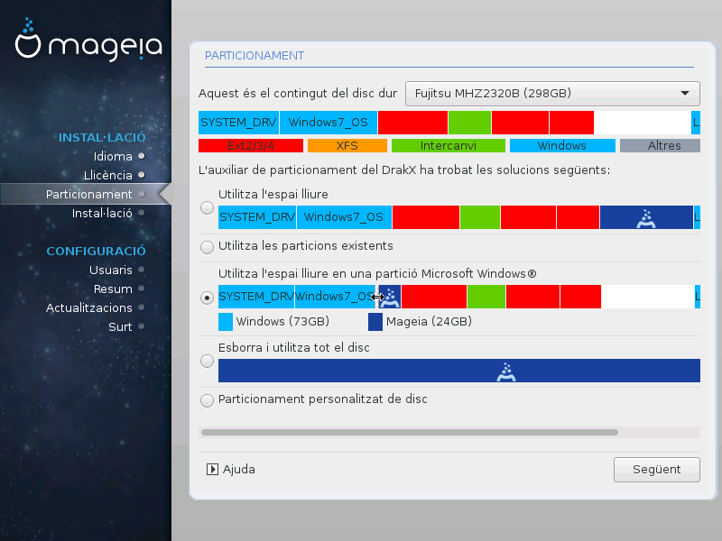 Si teniu espai lliure al disc dur, aquesta opció l'aprofitarà per a la instal·lació de Mageia.