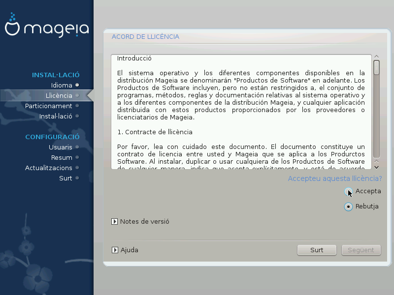 Abans d'instal·lar Mageia, llegiu atentament els termes i condicions de la llicència.