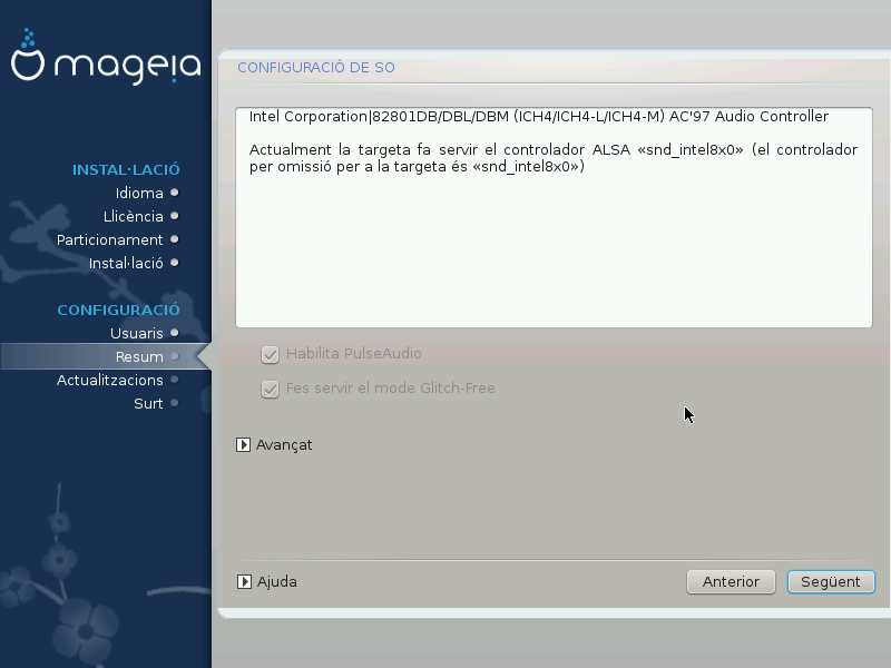 En aquesta pantalla es dona el nom del controlador que l'instal·lador ha triat per a la targeta de so, que serà el controlador per defecte si n'hi ha.