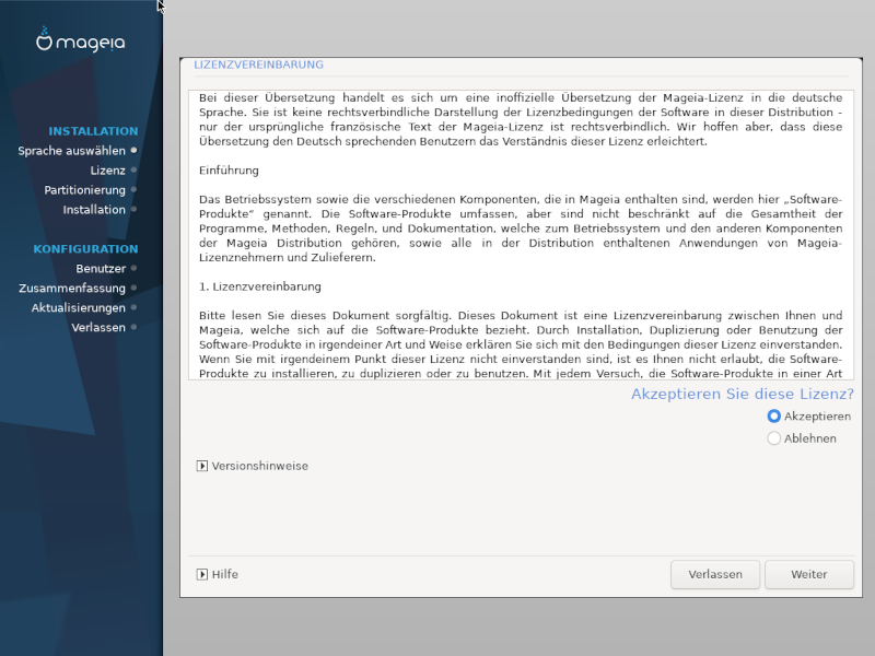 Lesen Sie sich bitte sorgfältig die Lizenzbedingungen durch, bevor Sie Mageia installieren.