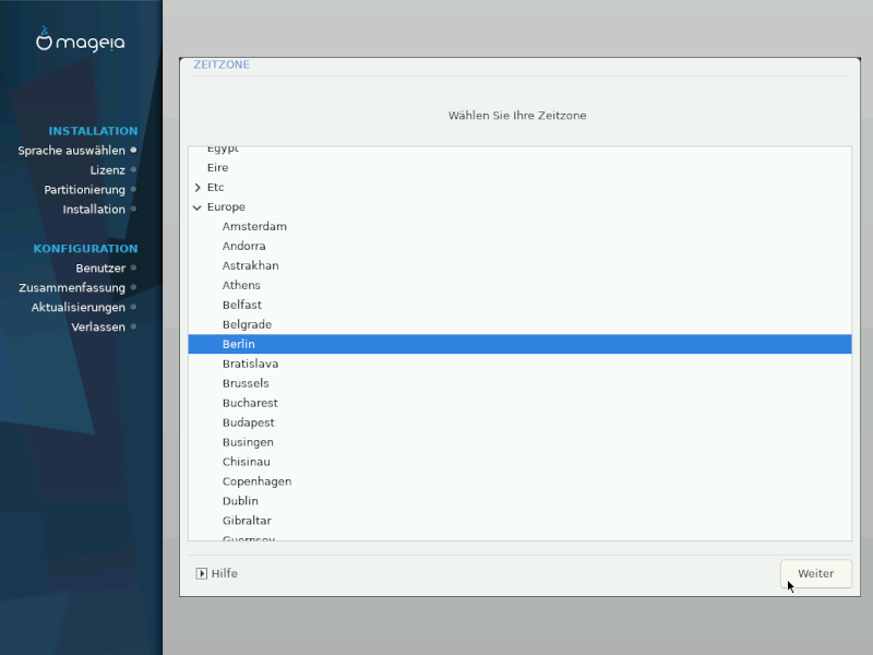 Wählen Sie die Zeitzone, indem Sie Ihr Land auswählen oder eine Stadt in Ihrer Nähe, mit der gleichen Zeitzone.