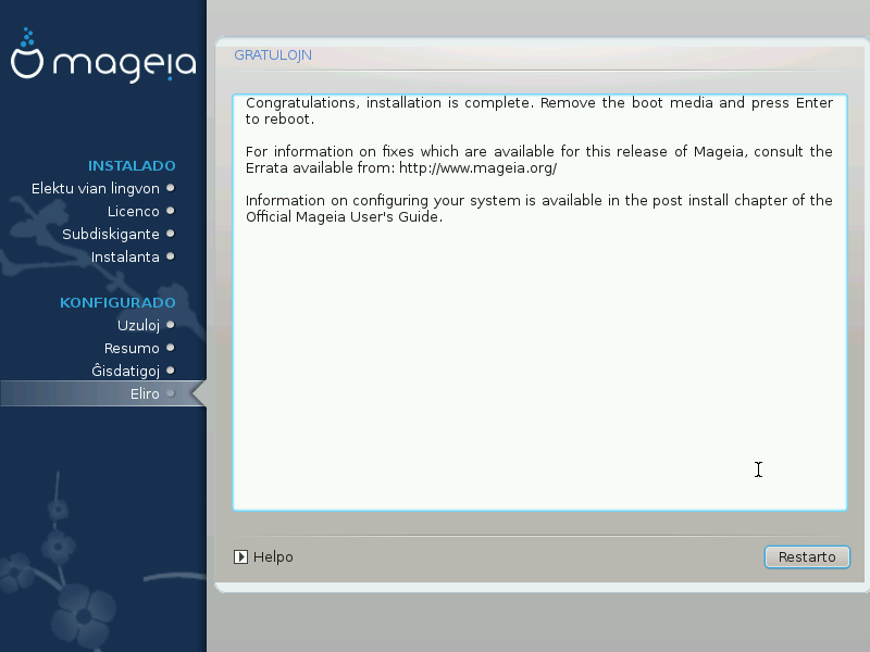You have finished installing and configuring Mageia and it is now safe to remove the installation medium and reboot your computer.