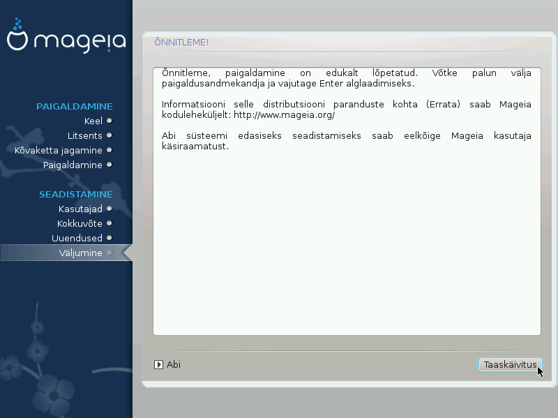 Olete lõpetanud Mageia paigaldamise ja seadistamise ning nüüd on turvaline eemaldada paigaldusandmekandja ja arvuti taaskäivitada.