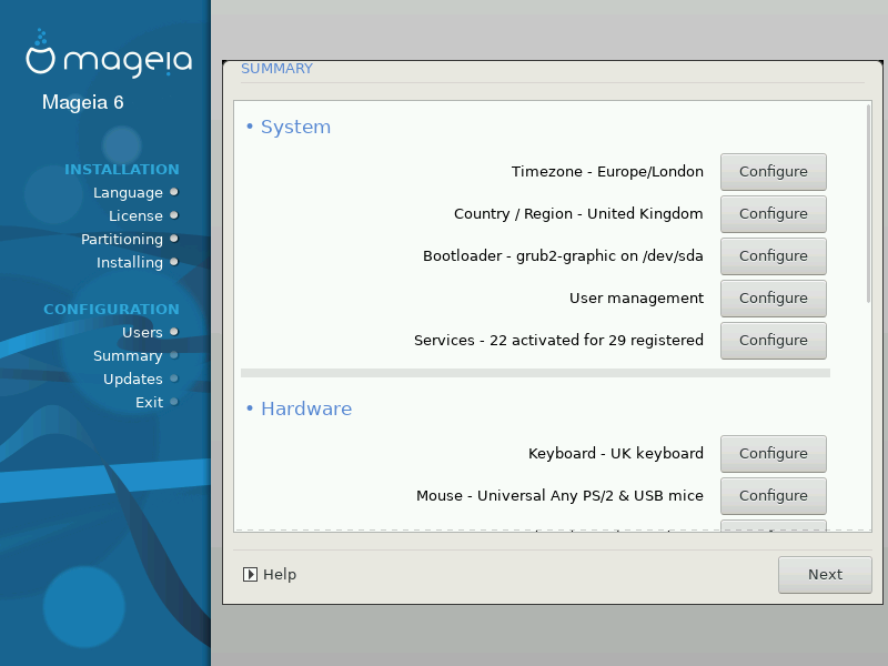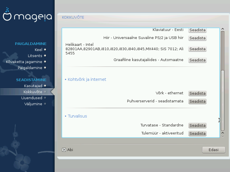 DrakX langetab Teie süsteemi seadistamisel mõistlikud otsused vastavalt Teie valikutele ja tuvastatud riistvarale. Siin saab neid seadistusi üle vaadata ja vajaduse korral muuta, klõpsates Seadista.