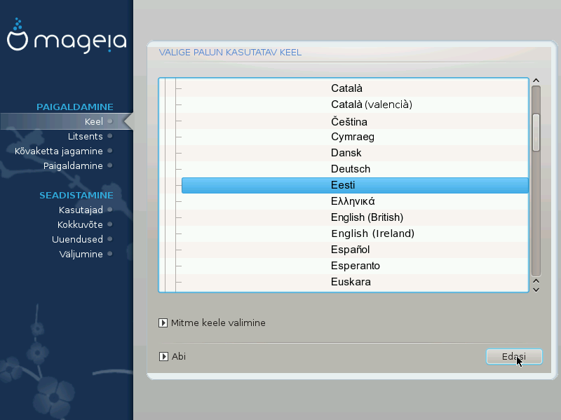Valige vajalik keel, laiendades nimekirja kõigepealt maailmajao järgi. Mageia kasutab langetatud valikut nii paigaldamise ajal kui ka paigaldatud süsteemis.
