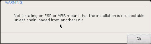 See tasub valida juhul, kui Mageia otsese laadimise asemel eelistatakse seda tööle panna teisest operatsioonisüsteemist ahellaadimisega. Näidatakse hoiatust, et alglaadur puudub. Klõpsake , kui olete täiesti kindel, et saate aru, mida see tähendab ja teeb ja tahate ikkagi jätkata.