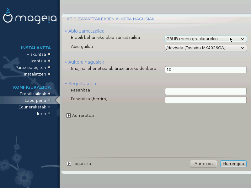 If you did not select rEFInd as the bootloader to use in the previous section, then your bootloader configuration options are shown below:
