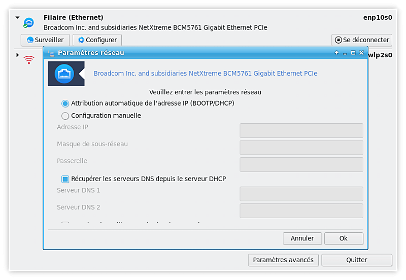 Si les paramètres réseau doivent être spécifiés manuellement, il est nécessaire en particulier de déclarer la passerelle avec l'adresse IP de la machine jouant le rôle de la passerelle.