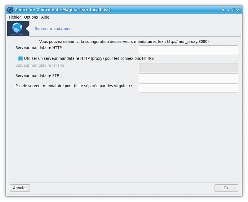 Si vous avez accédez à Internet via un serveur mandataire, vous pouvez utiliser cet outil [22] pour le configurer. L'administrateur système vous donnera les informations nécessaires. Il est aussi possible de spécifier certains services qui, par exception, sont accessibles en dehors du serveur mandataire.