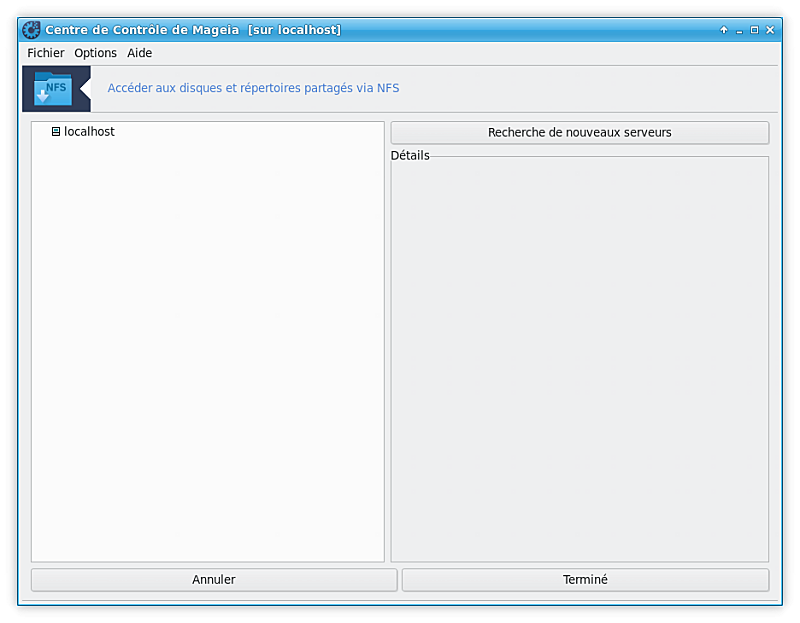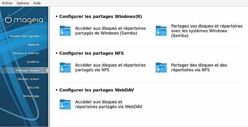 Il est possible de choisir dans cet écran entre plusieurs outils pour partager des disques et des répertoires. Cliquer sur un lien ci-dessous pour en savoir plus.