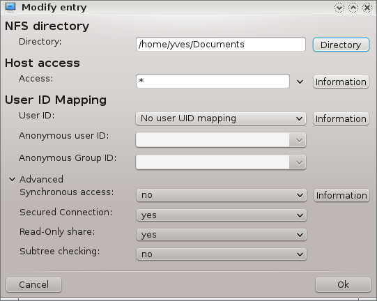 Vérification des sous-répertoires : active la vérification des sous-répertoires qui permet d'améliorer la sécurité dans certains cas, mais qui peut dégrader la fiabilité. Voir la page du manuel exports(5) pour plus de détails.