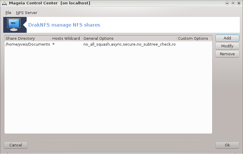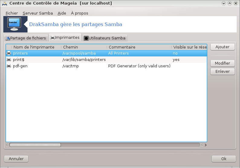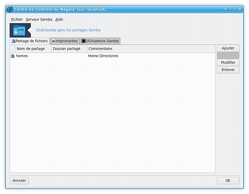 Cet outil [35]permet de déclarer quels dossiers partagés peuvent être accessibles par tous les utilisateurs de la machine. Le protocole utilisé pour cela est SMB qui fut popularisé sur les systèmes Windows(R) . Le dossier partagé sera disponible à chaque boot. Les dossiers partagés peuvent aussi être accédés directement lors d'une session utilisateur avec un outil tel qu'un gestionnaire de fichiers.