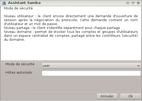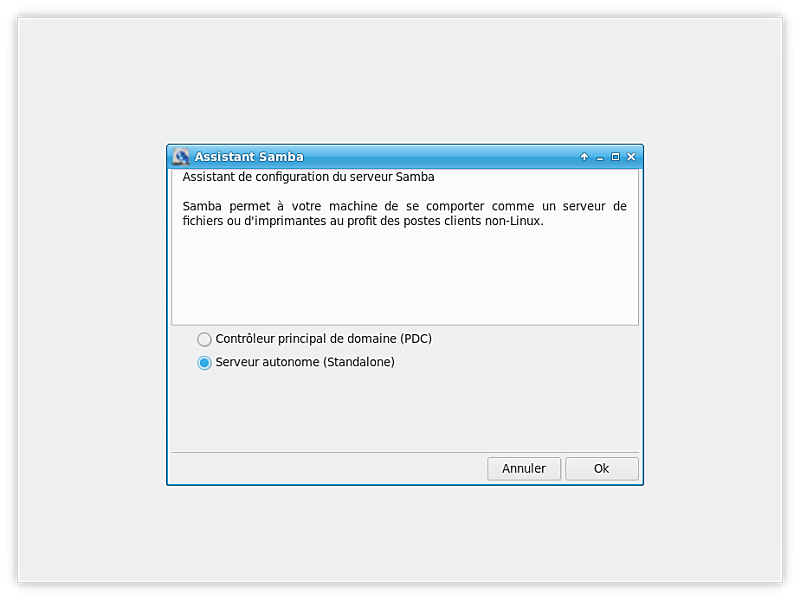 A la première mise en route, l'outil [36] vérifie que les paquetages nécessaires sont installés et propose le cas échéant de les installer. Ensuite, l'assistant de configuration du serveur Samba est lancé. Il est possible de retrouver cet assistant en cliquant dans le menu Serveur Samba/Configurer.