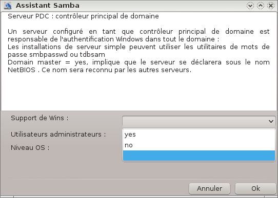 Si l'option "Contrôleur primaire de domaine" est retenue, l'assistant demande si Wins doit être supporté ou pas, ainsi que les noms des . Les étapes suivantes sont alors les mêmes que pour le serveur autonome, sauf qu'il est aussi possible de choisir le mode de sécurité :