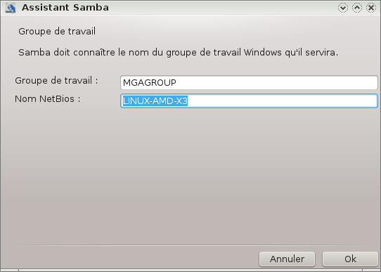 Puis, spécifier le nom du groupe de travail. Ce nom doit être le même que celui utilisé pour accéder aux ressources partagées.