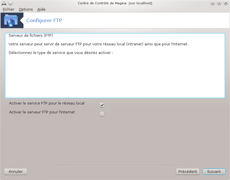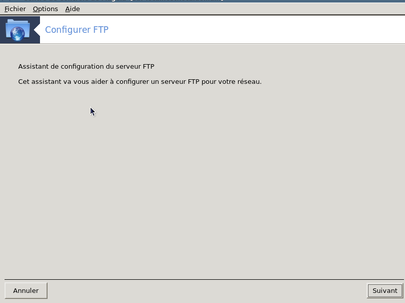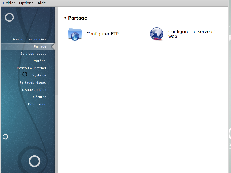 Cet écran ainsi que celui nommé Services réseau ne sont visibles qu'à la condition que le paquetage drakwizard soit installé. Vous pouvez choisir entre plusieurs outils pour configurer différents serveurs. Cliquer sur un lien ci-dessous ou sur la section intitulée « Services réseau » pour en savoir plus.