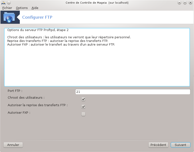 Paramétrer le port d'écoute, le répertoire chroot, permettre la reprise de transfert et le FXP (File eXchange Protocol).