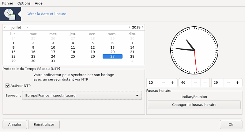 Sur la partie droite se trouve l'horloge. Il est inutile de la mettre à l'heure si le NTP est en service. Trois cases affichent les heures, minutes et secondes (19, 29 et 56 sur la copie d'écran). Utiliser les petites flèches pour régler l'heure. Il est impossible de changer le format d'affichage ici, pour cela utiliser les outils de configuration du bureau.