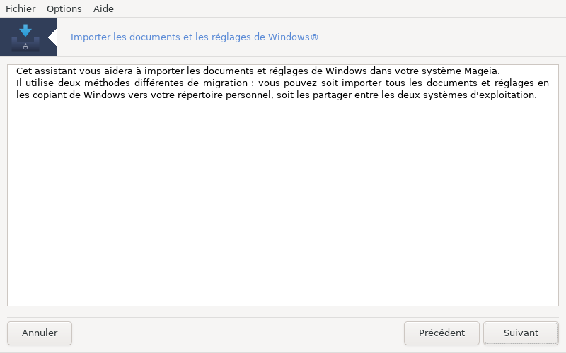 Cet outil permet à un administrateur d'importer les documents et paramètres d'un utilisateur depuis une installation de Windows® 2000, Windows® XP ou Windows® Vista™ sur le même ordinateur que l'installation de Mageia.