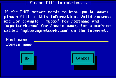Si vous n'êtes pas sûr de ce que cela signifie, vous pouvez laisser les champs vides, mettre Ok en surbrillance et appuyer sur Entrée pour continuer. La connexion réseau sera alors activée.