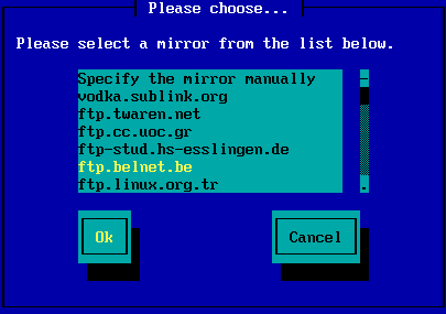 Si vous utilisez FTP ou HTTP, vous devez à présent indiquer un miroir à utiliser. Ceci peut être fait manuellement ou en choisissant à partir d'une liste.
