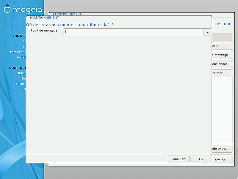 /,/homeet/var. Vous pouvez même créer vos propres points de montage, par exemple/videopour une partition sur laquelle vous voulez stocker des films, ou peut être/datapour tout vos fichier de données.Pour les partitions où l'accès n'est pas nécessaire, vous pouvez laisser vide le champ point de montage.