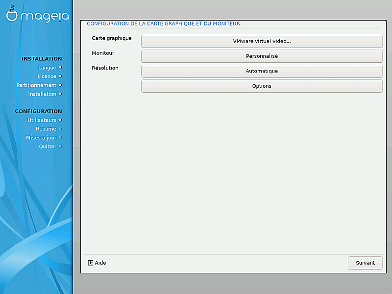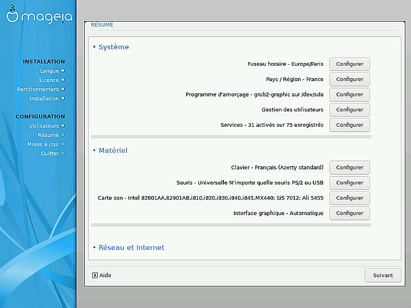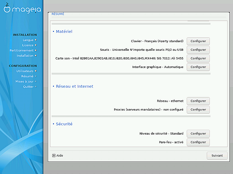 DrakX suggère des réglages judicieux pour la configuration du système en tenant compte des choix faits par vous-même et du matériel détecté. Il est possible ici de vérifier les paramètres et de les changer si souhaité en cliquant sur Configurer.