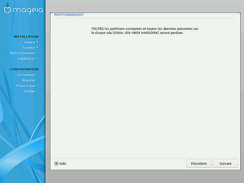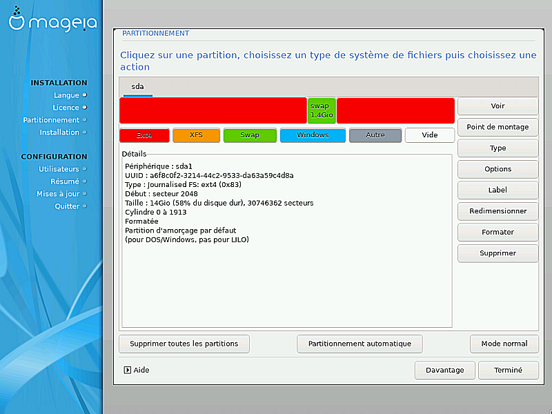 Utilisez cette option pour réaliser une installation à neuf de Mageia. Elle formatera la partition