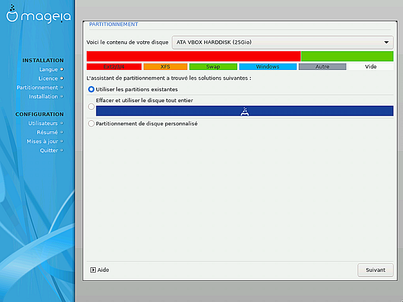 Si cette option est disponible, alors des partitions compatibles avec Linux ont été trouvées et sont utilisables pour l'installation de Mageia.