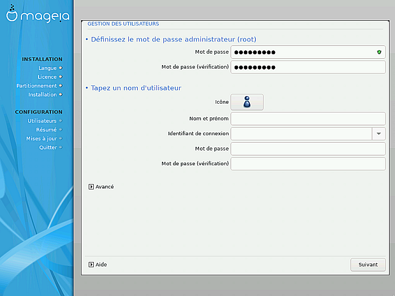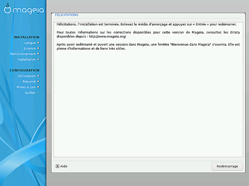 L'installation et la configuration de Mageia sont terminées et il est maintenant possible d'enlever le support d'installation et de redémarrer l'ordinateur.
