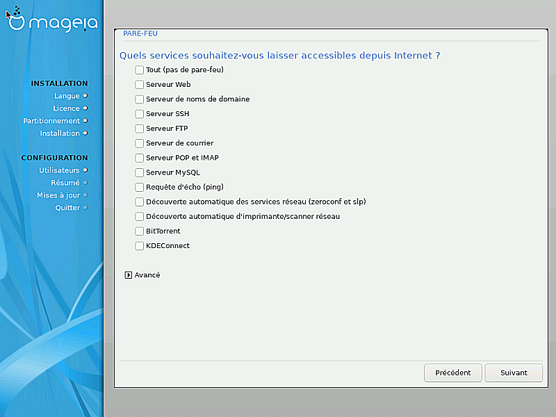 Dans la configuration par défaut, aucune case n'est cochée et aucun service n'est accessible de l'extérieur. Le bouton Tout (pas de pare-feu)autorise l'accès à tous les services de la machine - une option qui n'a beaucoup de sens dans le contexte de l'installateur puisque le système n'est plus protégé. Sa véritable utilisation dans le contexte du Centre de Contrôle de Mageia (qui utilise la même interface) pour désactiver de manière temporaire l'ensemble des règles du pare-feu à des fins de test et de débogage.