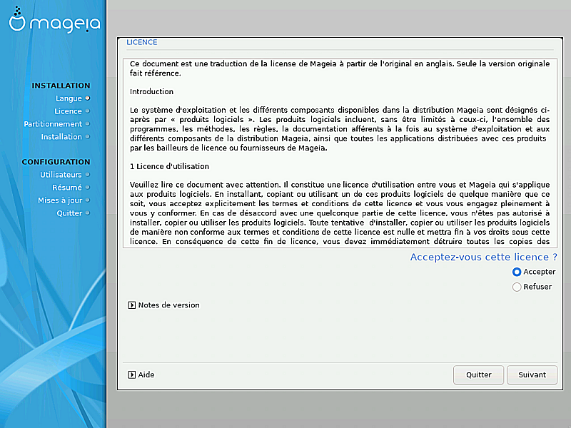 Avant d'installer Mageia, veuillez lire les termes et conditions de la licence avec attention.