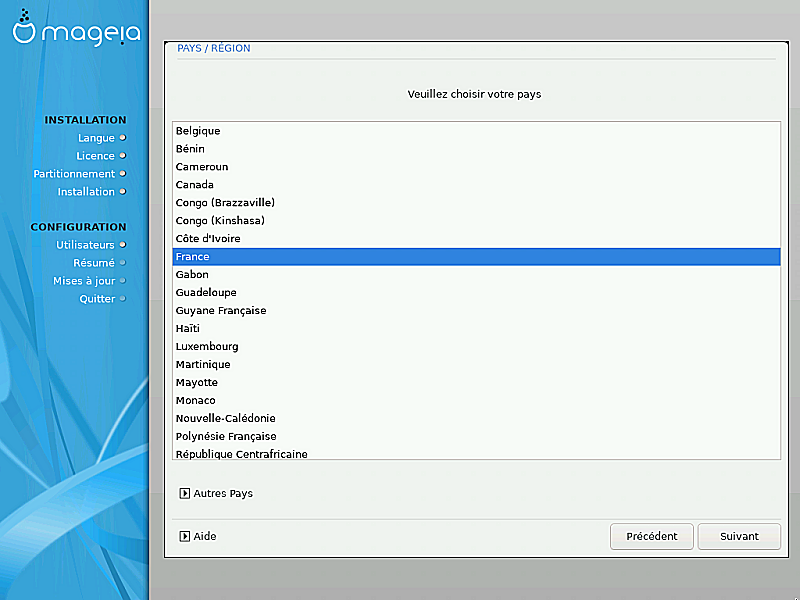 Si votre pays se trouve uniquement dans la liste Autres pays , après avoir cliqué sur OK, il peut sembler qu'un pays de la première liste ait été choisi. N'y prêtez pas attention, DrakX respectera votre choix.