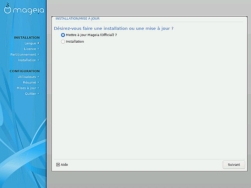Utilisez cette option pour mettre à jour une version de Mageia préalablement installée.
