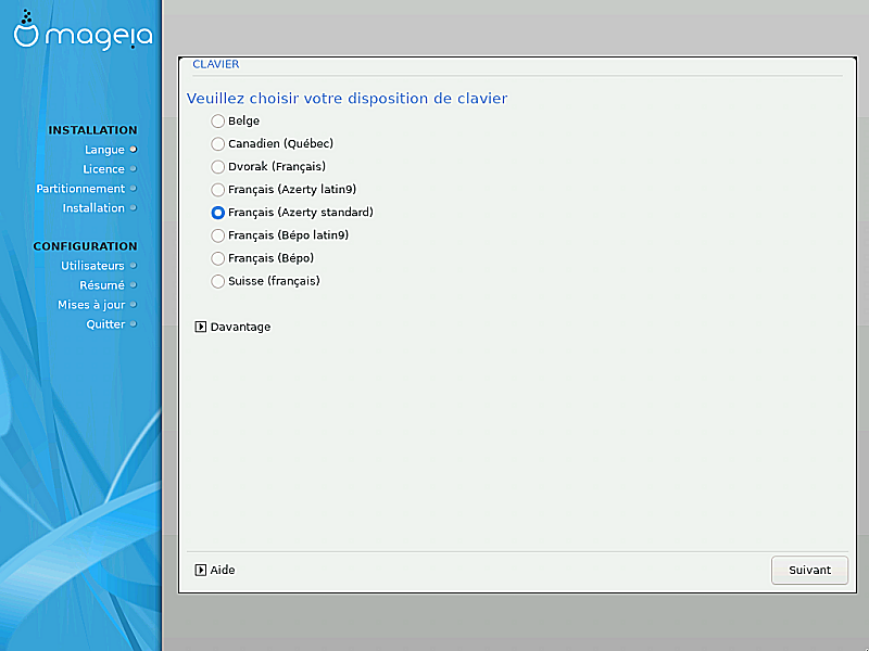 Après avoir choisi un clavier dans la liste obtenue en cliquant sur Davantage, vous reviendrez à la première liste, et il vous semblera que c'est un clavier de cette liste qui a été sélectionné. N'y prêtez pas attention et continuez l'installation : le clavier choisi depuis la liste complète sera bien pris en compte.