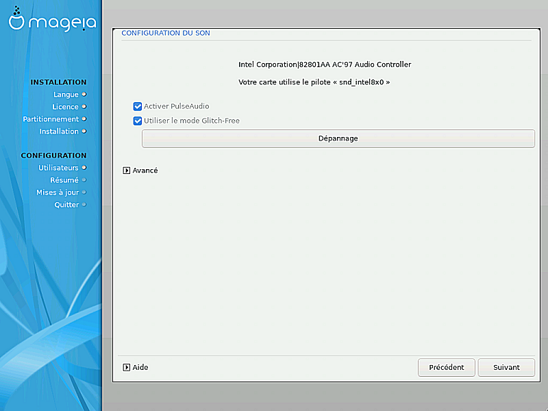 S'il n'existe aucun pilote par défaut pour votre carte son, il est peut-être possible de choisir parmi d'autres pilotes. Si c'est le cas, ou si vous pensez que l'installeur n'a pas fait le meilleur choix, cliquez sur Avancé pour choisir le pilote manuellement.