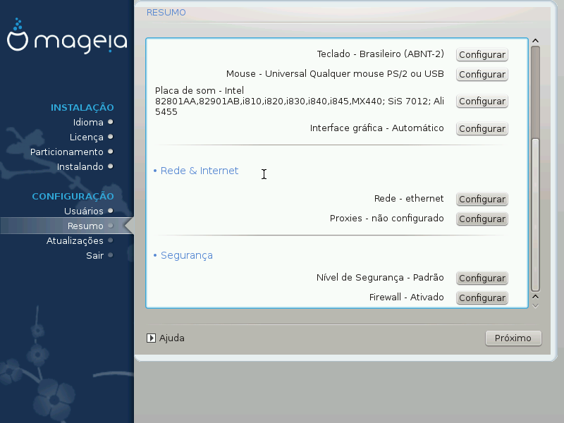 O DrakX apresenta uma proposta para a configuração do seu sistema com base nas escolhas que faz e no hardware detectado. Você pode verificar as configurações aqui e alterá-las se desejar, pressionando Configurar.
