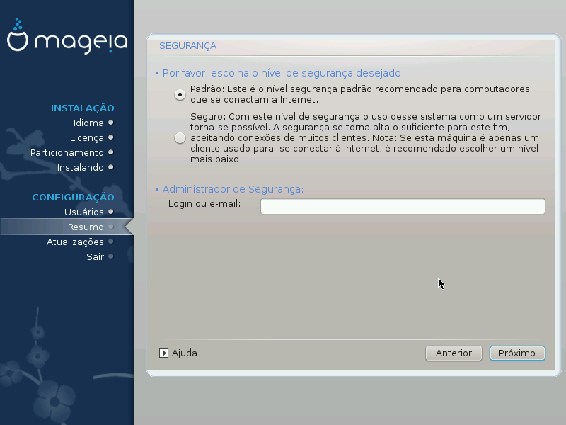 Sempre será possível ajustar suas configurações de segurança após a instalação na seção Segurança do Centro de Controle do Mageia.