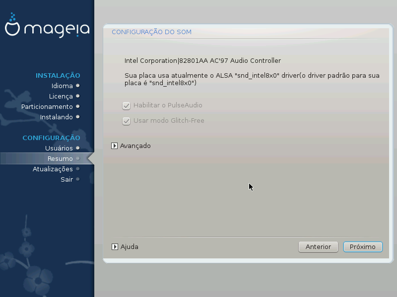 O driver padrão deve funcionar sem problemas. No entanto, se após a instalação você encontrar problemas, execute draksound ou inicie essa ferramenta através do CCM (Centro de Controle do Mageia), selecionando a guia Hardware e clicando em Configuração de som no canto superior direito da tela.