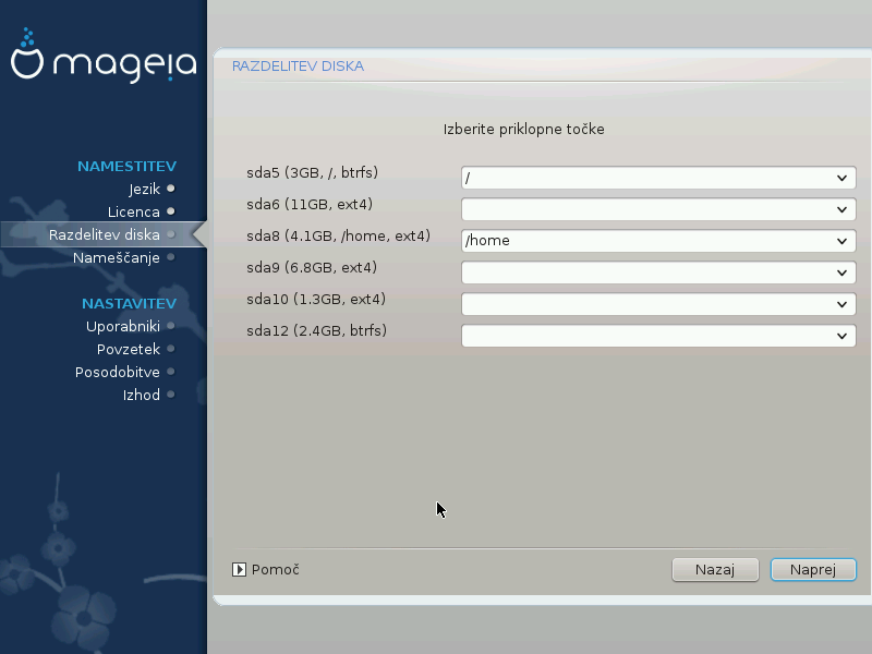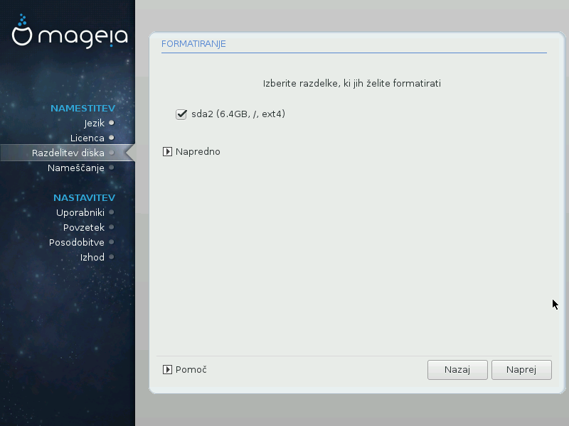 Če je vsega razpoložljivega prostora na voljo manj kot 50 GB, bo ustvarjen samo en razdelek in sicer korenski: 1/1(root). Brez ločenega domačega razdelka: /home.