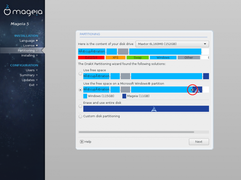 With this option, the installer displays the remaining Windows partition in light blue and the proposed Mageia partition in dark blue with their intended sizes just underneath. You have the option to modify these sizes by clicking and dragging the gap between both partitions. See the following screenshot: