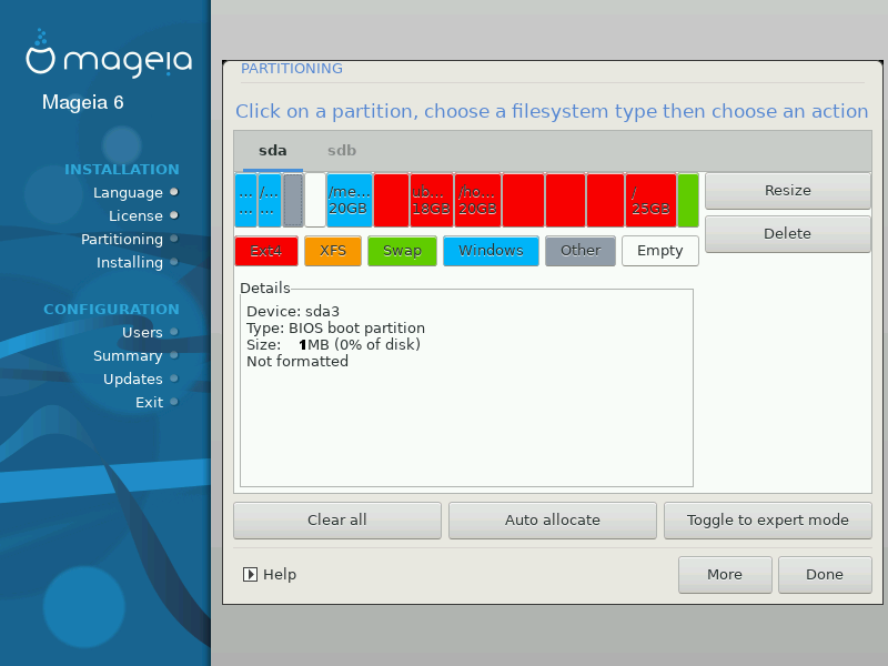 sda,sdb,sdcetc.For all other actions: click on the desired partition first. Then view it, or choose a filesystem and a mount point, resize it or wipe it. Expert mode provides more options such as to label (name) a partition, or to choose a partition type.