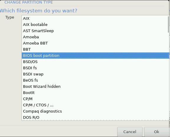 /boot/EFI. See Figure 1 below.If you are installing Mageia on a Legacy/GPT system, check that a BIOS boot partition is present and of the correct type. See Figure 2 below.