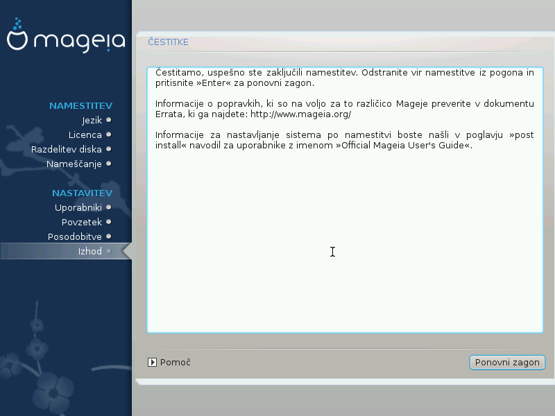 You have finished installing and configuring Mageia and it is now safe to remove the installation medium and reboot your computer.