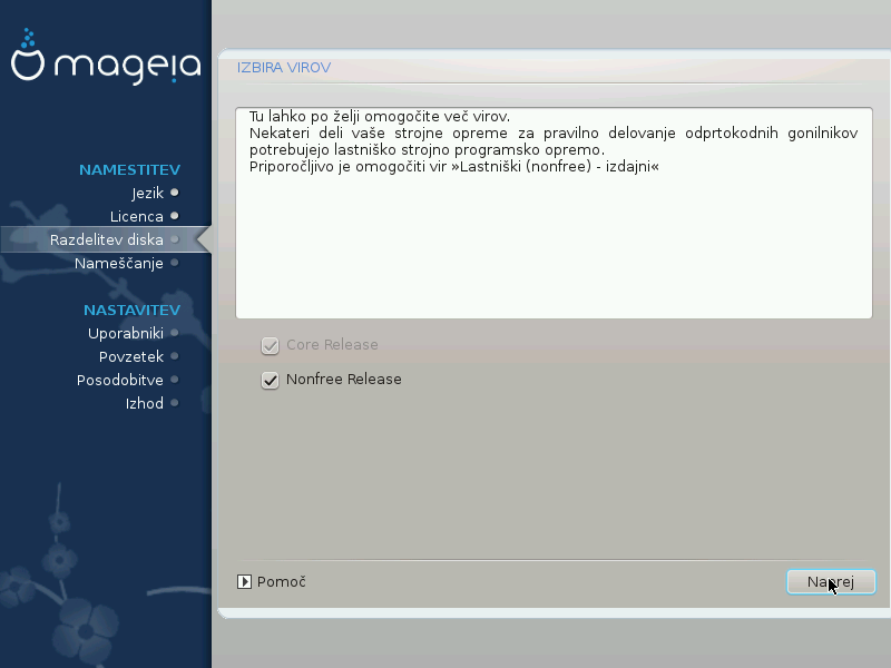 Izbor zrcala ali določanje URL-ja (čisto prvi vnos). Z izborom zrcala pridobite dostop do vseh skladišč, ki jih upravlja skupnost Mageia, Npr. z lastniško programsko opremo: Nonfree ali Patentno zaščiteni: Tainted in seveda posodobitve. Z določanjem URL-ja lahko določite specifično skladišče ali vašo lastno namestitev NFS.