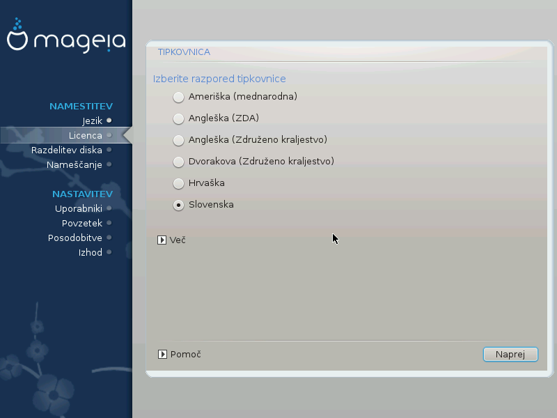 DrakX selects an appropriate keyboard for your language. If no suitable keyboard is found it will default to a US keyboard layout.