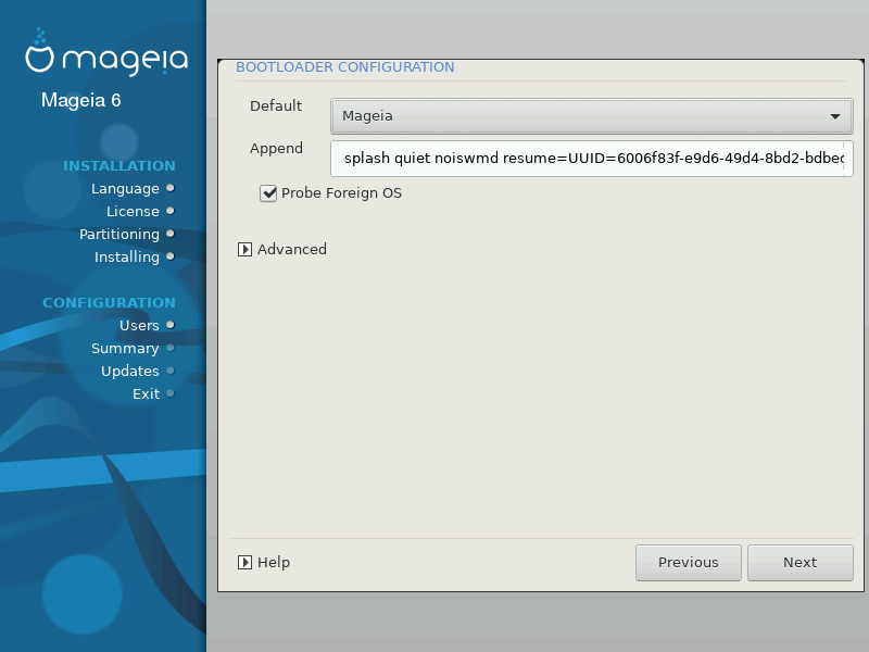 While you can opt to install Mageia without a bootloader (see section 2.1 Advanced), this is not recommended unless you absolutely know what you are doing, as without some form of bootloader your operating system will be unable to start.